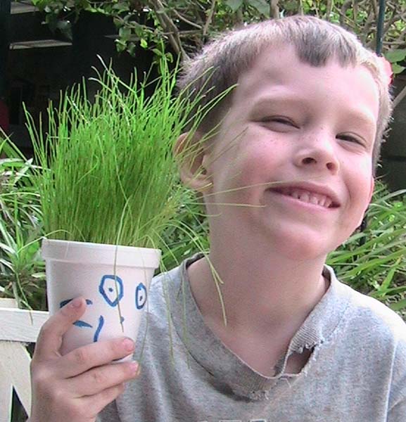 Quinn also did several projects in class. In March, he learned to grow grass. The decorated cups are affectionately known as Mr.Grass. |